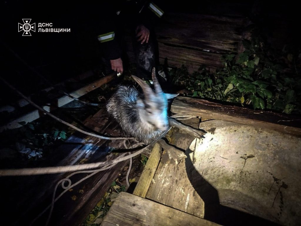 Рятувальники сел. Великий Любінь за допомогою рятувальної мотузки обережно витягнули на поверхню козеня та передали власнику.