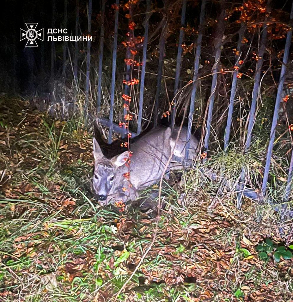 До Служби порятунку надійшло повідомлення про те, що у місті Трускавець Дрогобицького району, поблизу місцевого озера, у металевій огорожі задньою частиною тіла застрягла косуля.