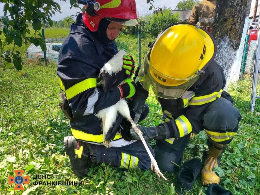 Подія трапилася у селі Слобода-Долинська, Долинської ТГ. На місці події рятувальники обережно вивільнили птаха, оглянули на наявність травм і за допомогою висувної драбини повернули лелеченя назад у гніздо.
