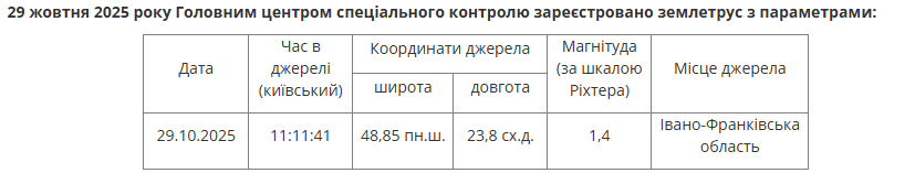 30 жовтня 2025 року о 11:11:41 Головним центром спеціального контролю зареєстровано землетрус вКалуському районі Івано-Франківської області, на глибині 2 км. За класифікацією землетрусів відноситься до невідчутних.