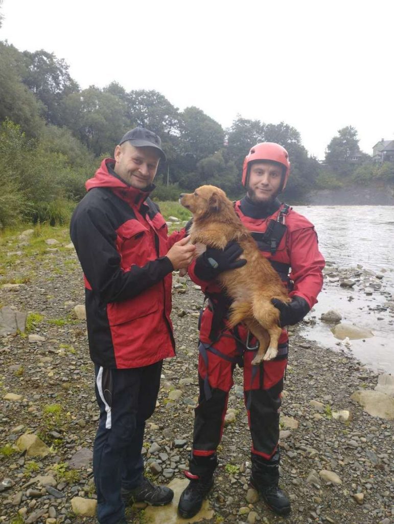 На допомогу вирушили рятувальники пошуково-рятувального відділення міста Яремче, які організовали переправу через річку Прут, піднялися по скелястій поверхні та допомогли собакам, одна з яки, як тільки відчула під ногами рівну поверхню чкурнула у пошуках пригод, а інша дочекалася закінчення рятувальної операції та вдячно попозувала з рятувальниками.