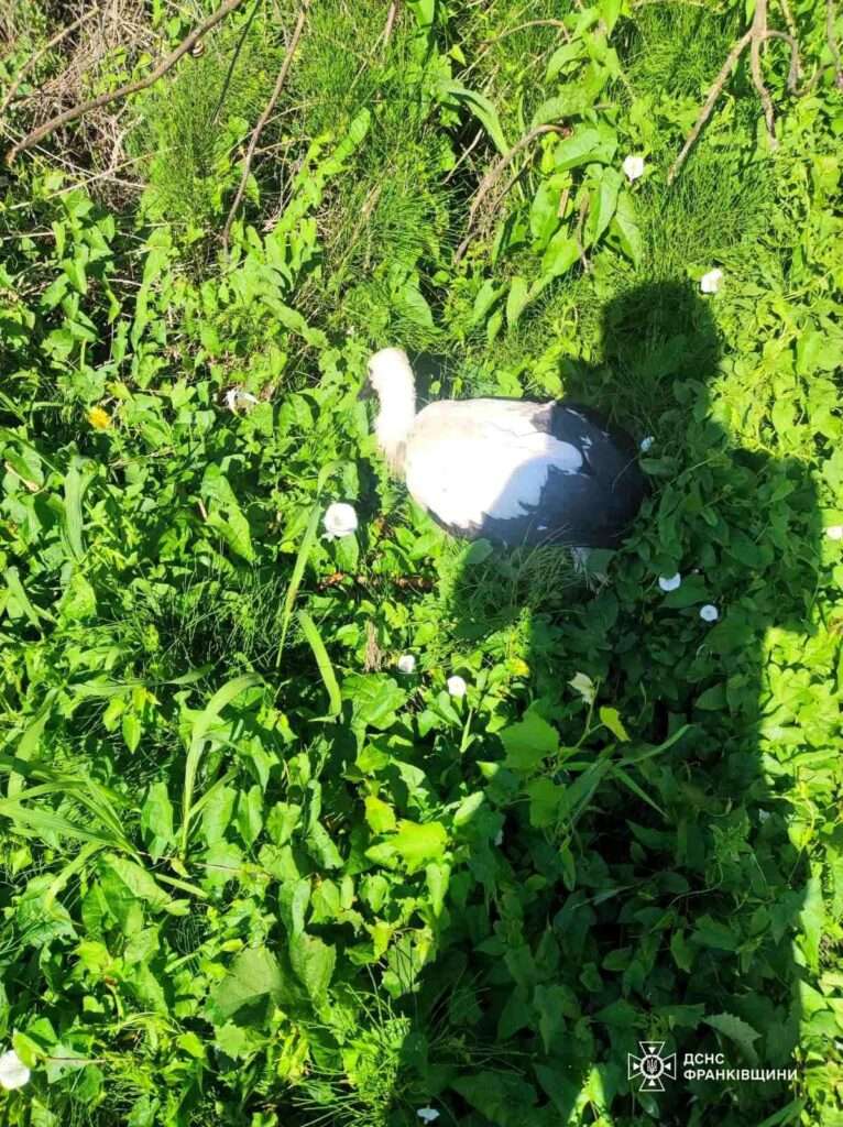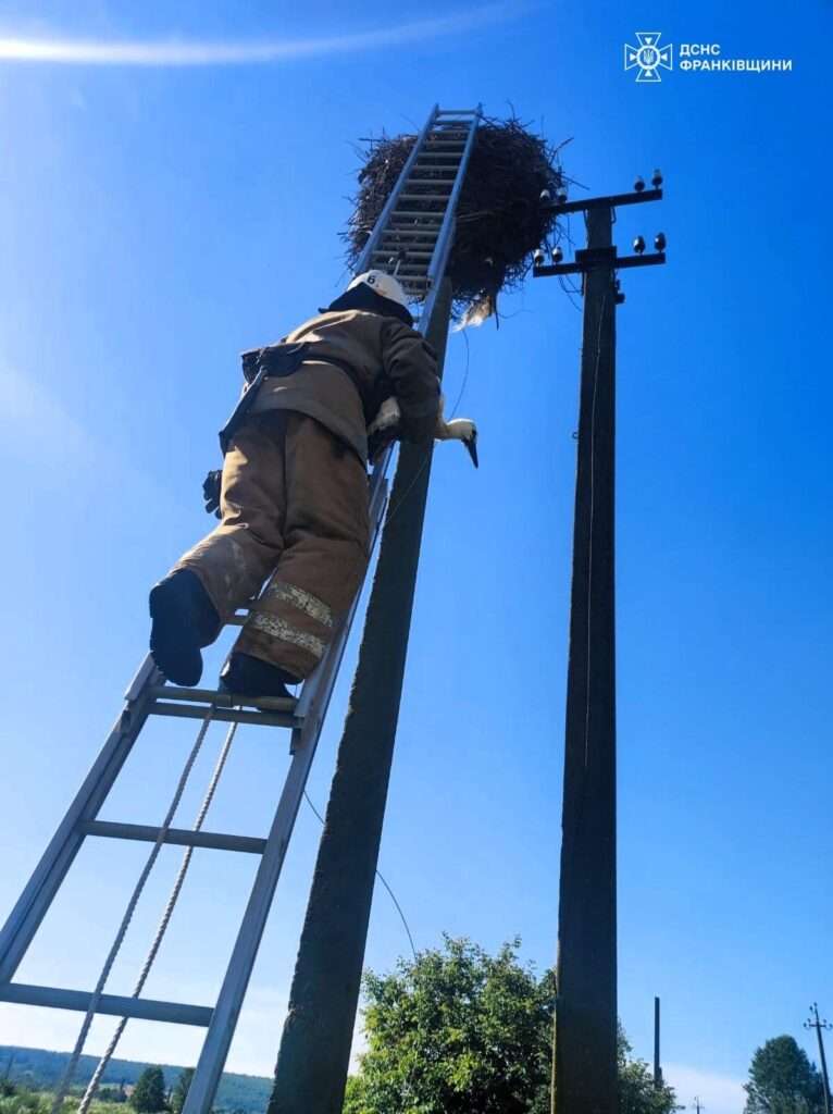 На місці події рятувальники підняли птаха, оглянули на наявність травм і за допомогою висувної драбини повернули лелеченя додому.