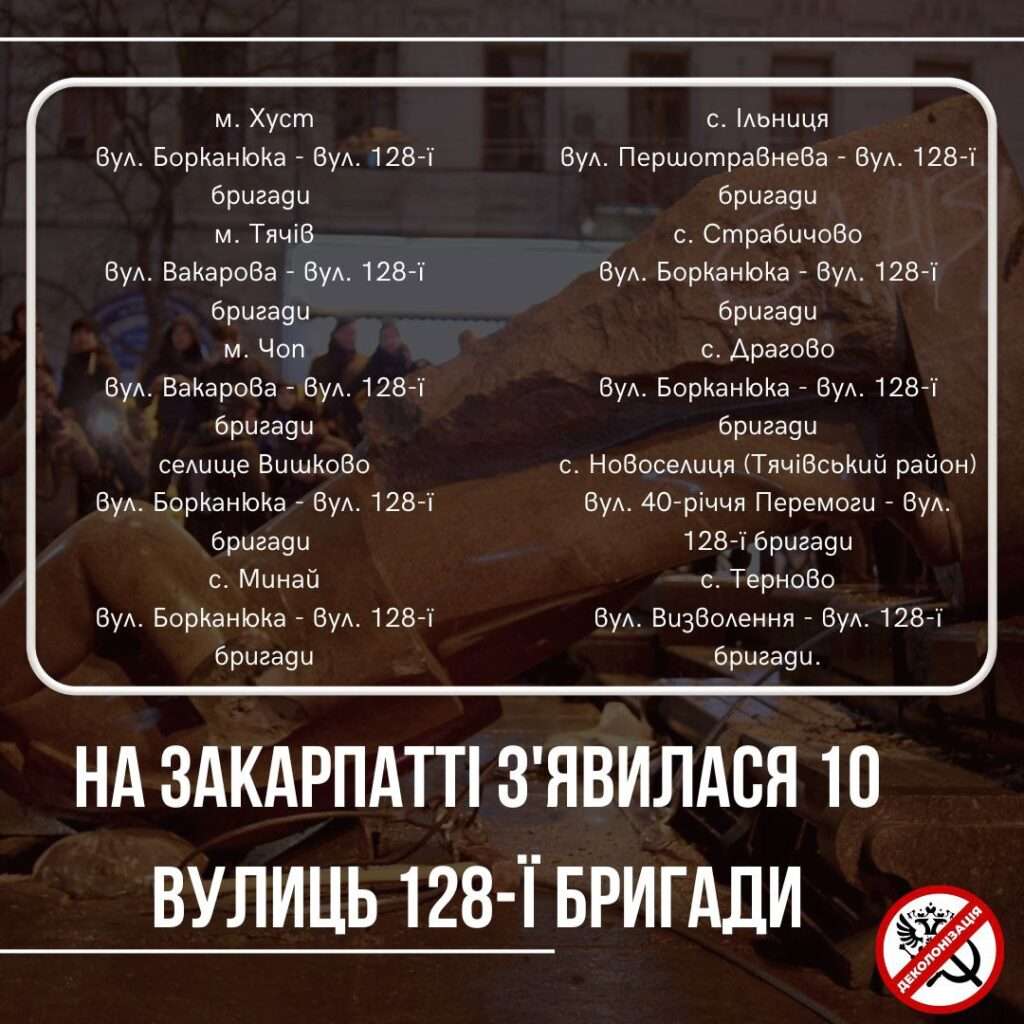 “Завдяки розпорядженню голови обласної адміністрації на Закарпатті з’явилося 10 вулиць, названих на честь героїчної 128-ї бригади”, – йдеться в повідомленні.