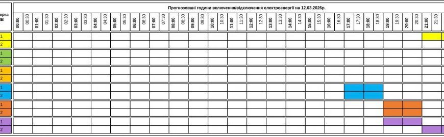 Енергетики опублікували прогнозований графік погодинних включень та відключень електроенергії на 12 березня 2026 року.