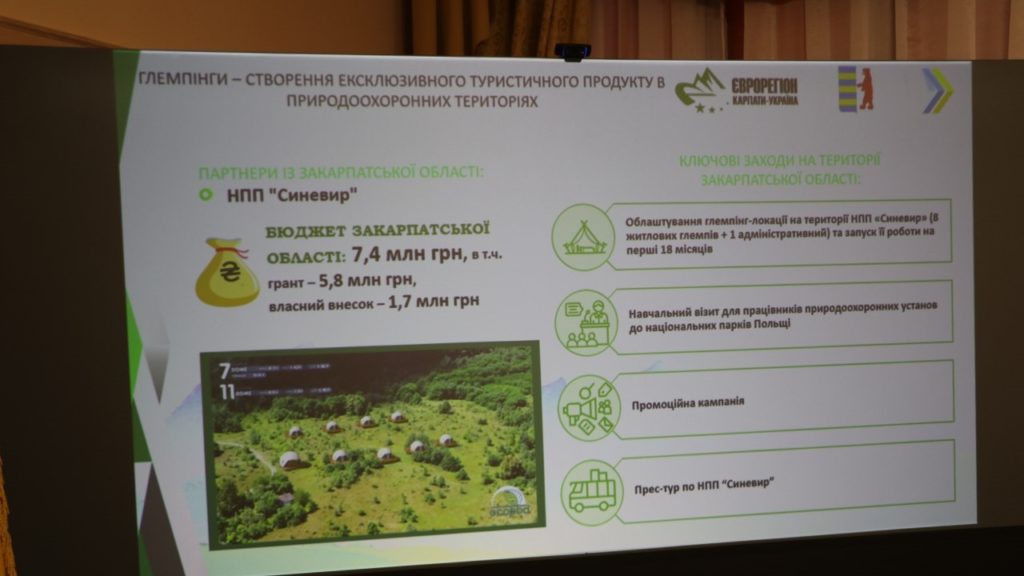 У рамках проєкту буде облаштовано і забезпечено ефективну роботу і маркетинг глемпінг-локацій в пілотних природоохоронних установах 4 областей: Донецької, Закарпатської, Івано-Франківської, Львівської, проведено широку промоційну кампанію туристичного потенціалу природно-заповідних територій