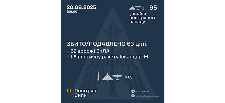 У ніч на 20 серпня (із 19.30 19 серпня) противник атакував 2-ма балістичними ракетами Іскандер-М (із ТОТ Криму), а також та 93-ма ударними БпЛА типу Shahed і безпілотниками-імітаторами різних типів із напрямків: Шаталово, Брянськ, Міллерово, Приморсько-Ахтарськ – рф, Чауда – ТОТ Криму.