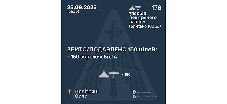 У ніч на 25 вересня (із 18.00 24 вересня) противник атакував 176-ма ударними БпЛА типу Shahed, Гербера і безпілотниками інших типів із напрямків: Курськ, Орел, Міллєрово, Приморсько-Ахтарськ – рф., Чауда – ТОТ Криму, близько 100 із них – шахеди.