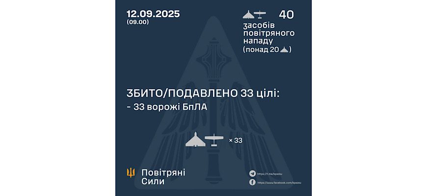 У ніч на 12 вересня (із 22.00 11 вересня) противник атакував 40 ударними БпЛА типу Shahed, Гербера та безпілотниками інших типів із напрямків: Курськ, Міллєрово, Приморсько-Ахтарськ – рф., понад 20 із них – шахеди.