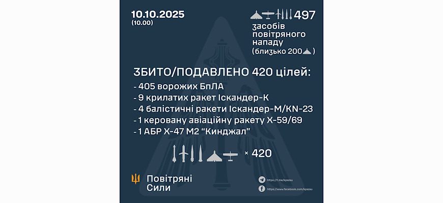За попередніми даними, станом на 10.00, протиповітряною обороною збито/подавлено 420 повітряних цілей: