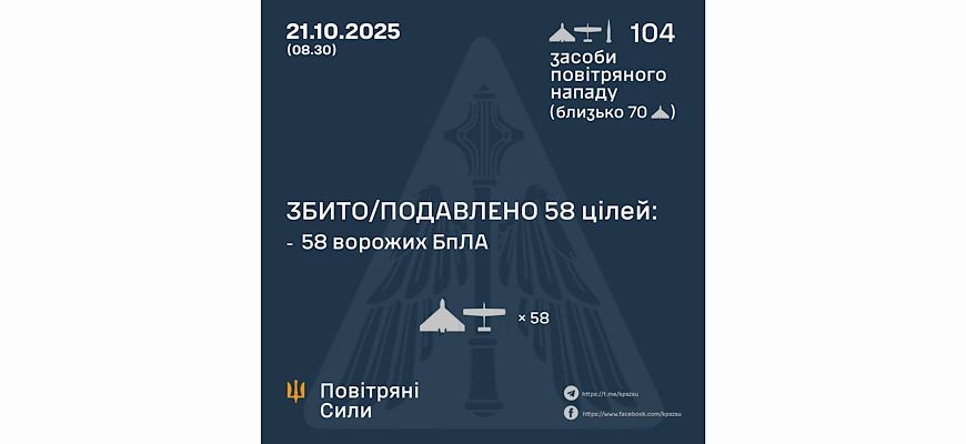 У ніч на 21 жовтня (з 19:00 20 жовтня) противник атакував 2-ма балістичними ракетами Іскандер-М/KN-23 із Брянської обл., 4-ма зенітними керованими ракетами С-300 із Курської обл., 98-ма ударними БпЛА типу Shahed, Гербера і безпілотниками інших типів із напрямків: Курськ, Орел, Приморсько-Ахтарськ – рф., Чауда, Гвардійське – ТОТ Криму, близько 70 із них – “шахеди”.