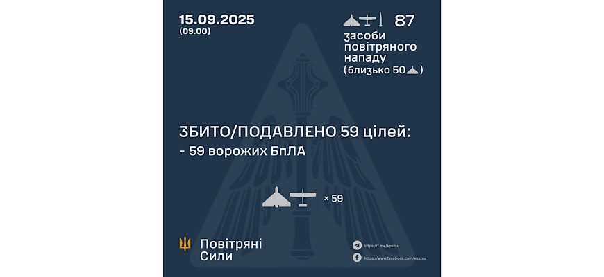 За попередніми даними, станом на 09.00, протиповітряною обороною збито/подавлено 59 ворожих БпЛА типу Shahed, Гербера і дронів інших типів на півночі, півдні та сході країни.
