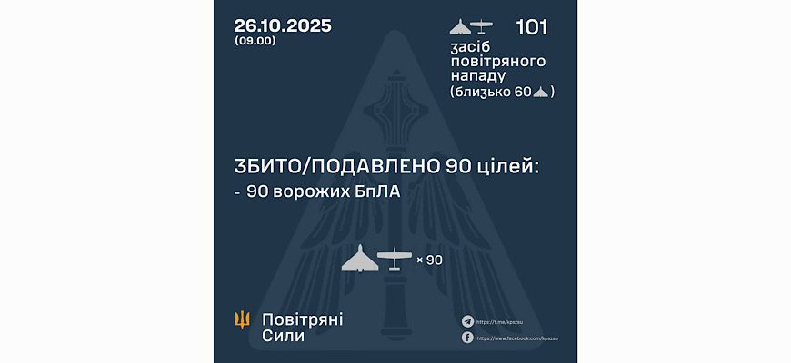 У ніч на 26 жовтня (з 20:00 25 жовтня) противник атакував 101 ударним БпЛА типу Shahed, Гербера і безпілотниками інших типів із напрямків: Курськ, Орел, Брянськ, Приморсько-Ахтарськ – рф, Гвардійське – ТОТ АР Крим, близько 60 із них – «шахеди».