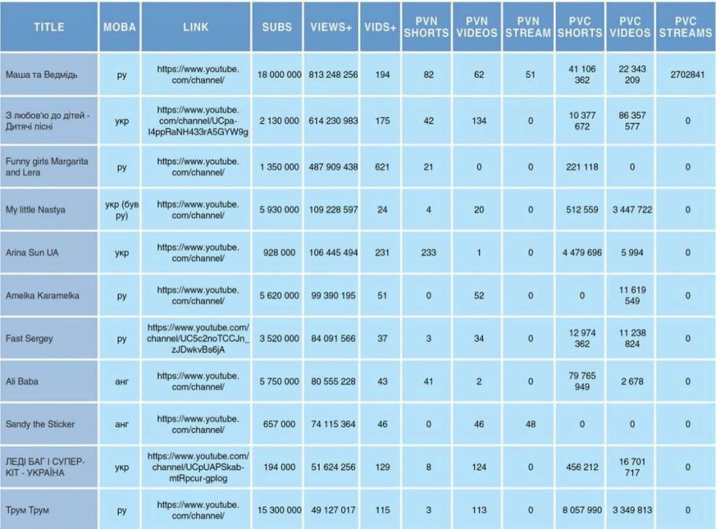 Загалом у двадцятці найпопулярніших дитячих каналів на ютубі, які позиціюються із країною реєстрації Україна, половина є українськомовними.