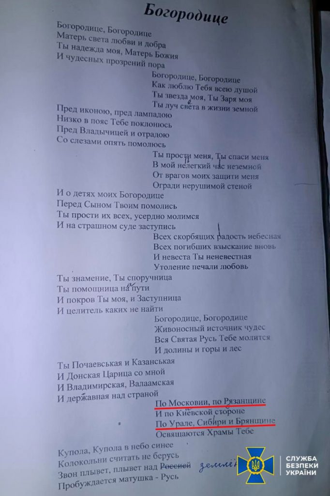 Також під час заходів СБУ знайшла тексти проросійських пісень, якими прославляли «русскую землю» і закликали до «пробуджения матушки-Руси».