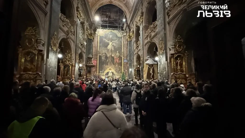 Домовину поставили у центральній частині храму серед моря квітів – переважно червоних та білих троянд. Відвідувачі у будівлі не промовляють ані звуку, нібито намагаються не порушити траур та жалобу.