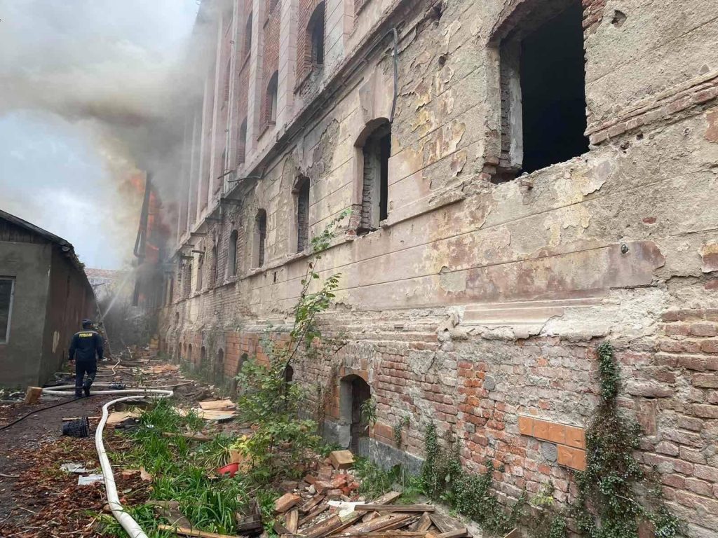 Рятувальники приборкують пожежу у будівлі, що не експлуатується на території заводу у Мукачеві на вул. Миру.