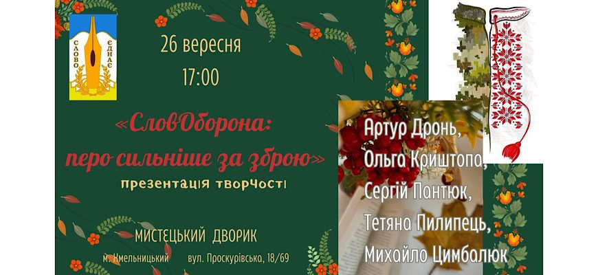 У межах Хмельницького міського літературного фестивалю «Слово єднає — 2025» 26 вересня о 17:00 в Мистецькому дворику Хмельницької ДМШ №1 ім. М. Мозгового (вул. Проскурівська, 18) відбудеться творча презентація, у якій візьмуть участь автори — учасники Всеукраїнського форуму військових письменників.