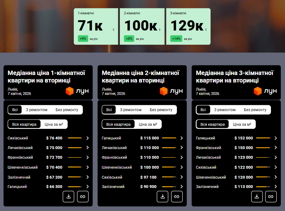 Водночас на ринку 3-кімнатних осель лідирує Галицький район із медіанною ціною 152 000 доларів.