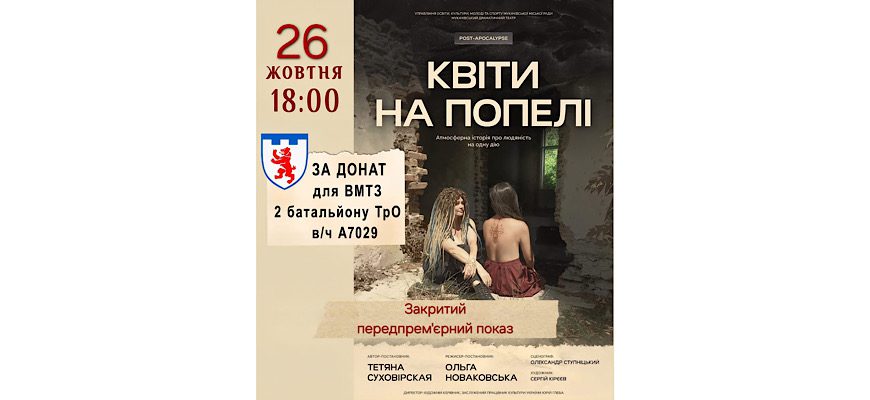 Мукачівський драматичний театр з метою збору донатів для ВМТЗ 2-го батальйону ТРО в/ч А7029, де наразі служить актор театру Євген Чобан організовує благодійний закритий передпрем’єрний показ вистави «Квіти на попелі».