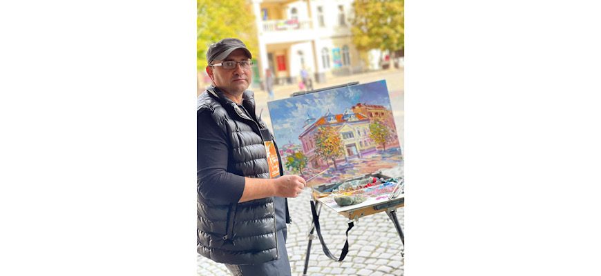 Тиберій Йонаш, один із учасників живописного пленеру обрав для творчої роботи локацію у центральній частині міста з видом на Мукачівський драматичний театр.