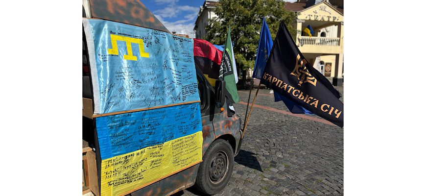 На центральній площі Мукачева розгорнули мобільну виставку “Війна в металі… Війна, як вона є”. На експозиції представлені артефакти російсько-української війни: снаряди, бронежилети, безпілотник, уламки мін та боєприпасів, шеврони та шоломи воїнів.