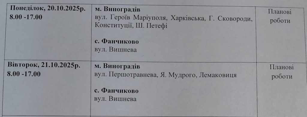 Головна » Закарпатські новини На Виноградівщині – планові відключення світла Опубліковано: 18:00, 17.10.2025 Закарпатські новини Відповідно до інформації ПрАТ «Закарпаттяобленерго» у зв’язку з плановими роботами буде відсутнє електропостачання: Виноградівська міська рада