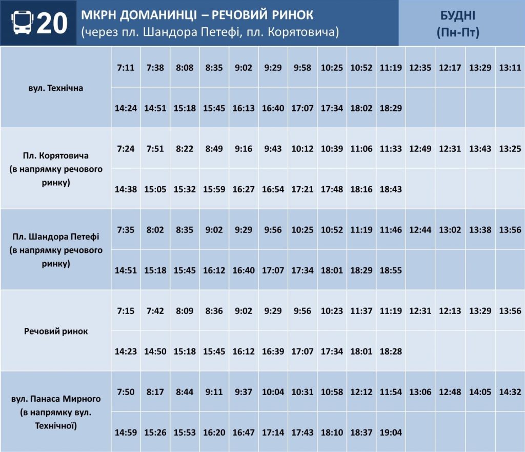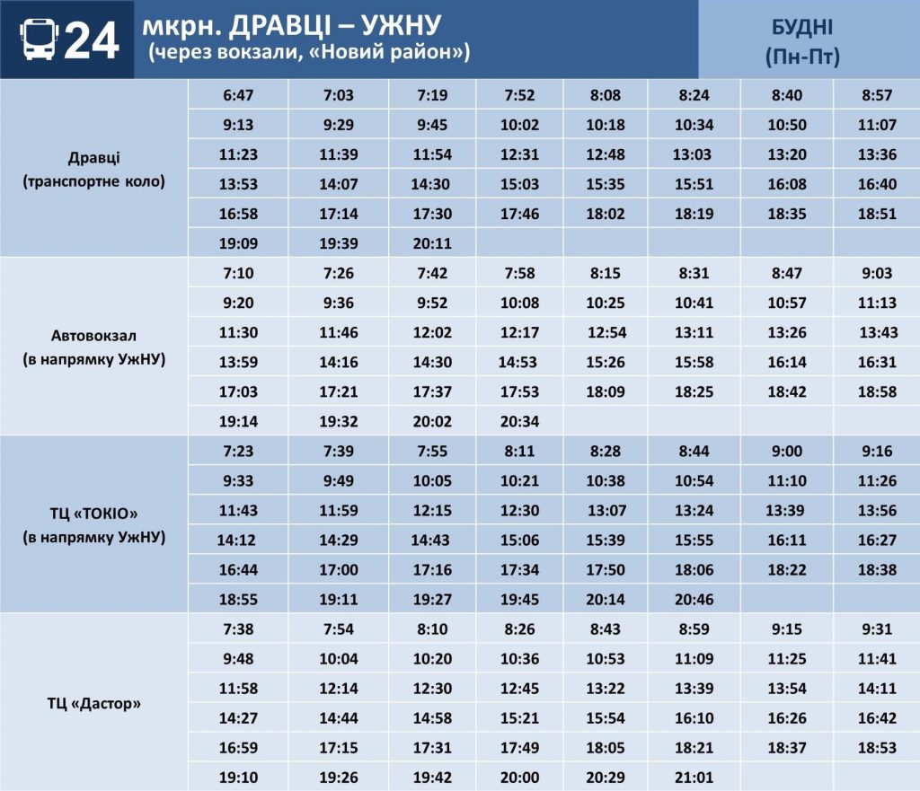 Комунальне підприємство “Ужгородський муніципальний транспорт” надає актуальні із 7 листопада графіки руху автобусів на міських маршрутах №№20, 24 та 156.
