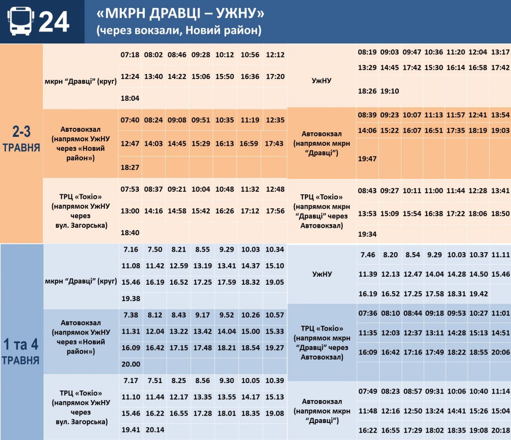 Головна » Соціум Ужгородців інформують про графік руху автобусів у святкові дні Опубліковано: 17:14, 01.05.2021 Закарпатські новини КП “Ужгородський муніципальний транспорт” та Ужгородська міськрада інформують про графік руху автобусів на маршрутах 1-4 травня: