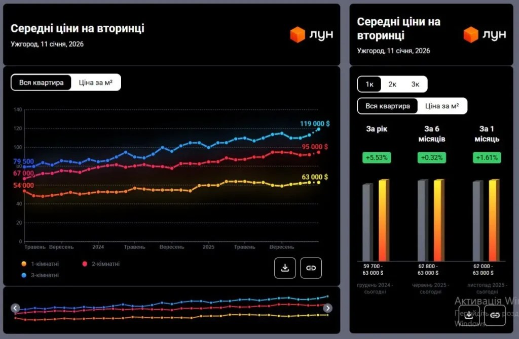 В Ужгороді ціни на оренду квартир за рік зросли до 30%, а двокімнатне житло в середньому коштує понад 30 тисяч гривень на місяць, що робить місто найдорожчим в Україні для орендарів. Купівля житла дорожчає повільніше, але однокімнатна квартира на вторинному ринку все одно обходиться в середньому у 61,7 тисячі доларів.