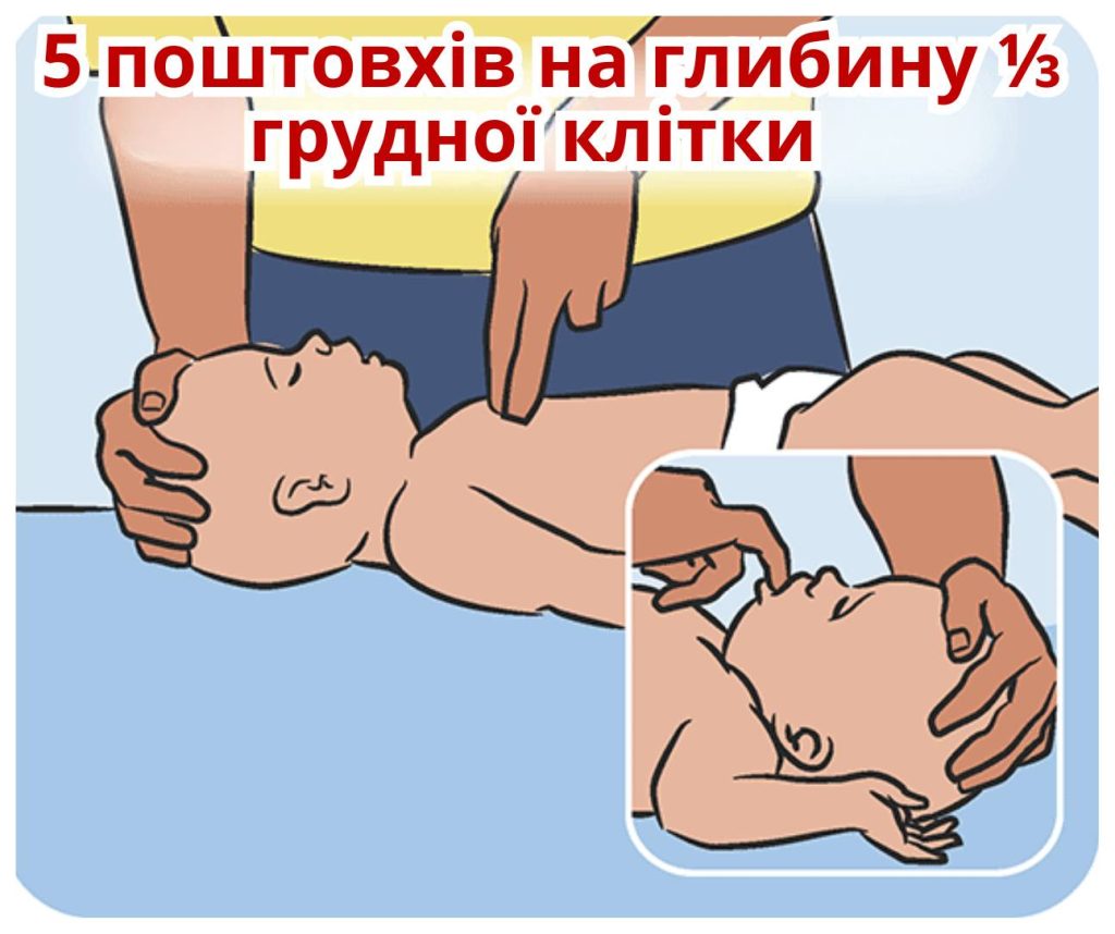 • Покладіть два пальці на середину грудини і зробіть 5 поштовхів на глибину ⅓ грудної клітки (НЕ натискайте на живіт!).