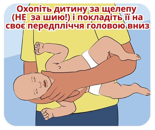 • Охопіть дитину за щелепу (НЕ за шию!) і покладіть її на своє передпліччя головою вниз, спираючись на ногу.