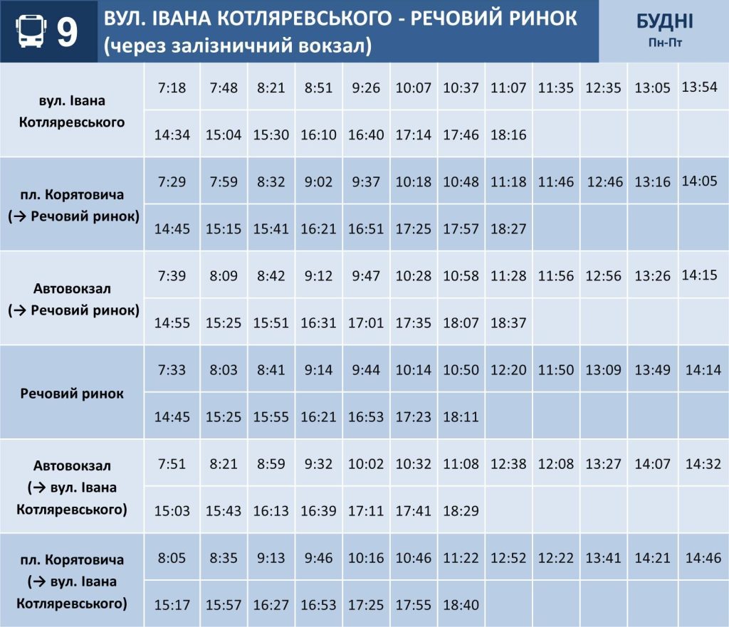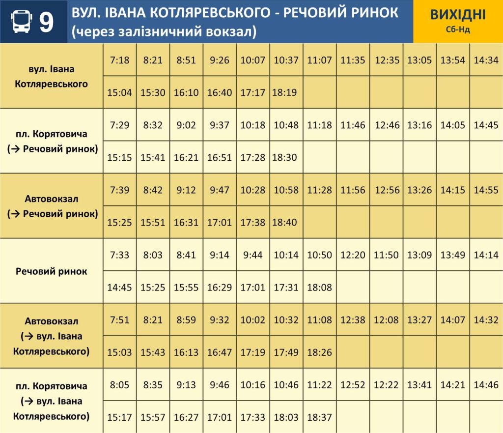Головна » Соціум В Ужгороді по-іншому курсуватиме 9 автобус (Графік) Опубліковано: 18:00, 29.05.2025 Закарпатські новини Із суботи, 31 травня, у звʼязку із зверненнями пасажирів вводяться нові графіки руху на маршруті №9. Про це інформує КП «Ужгородський муніципальний транспорт»