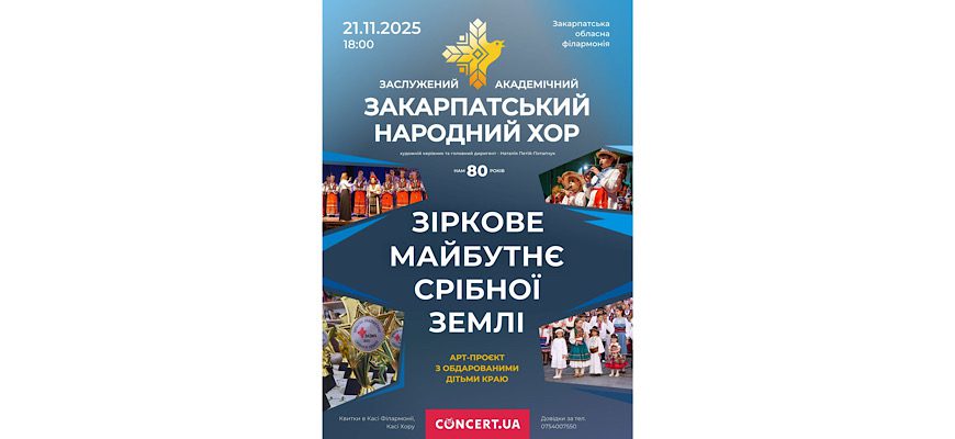 21 листопада у Закарпатській обласній філармонії відбудеться концерт Заслуженого академічного Закарпатського народного хору «Майбутнє Срібної Землі» Початок о 18:00.