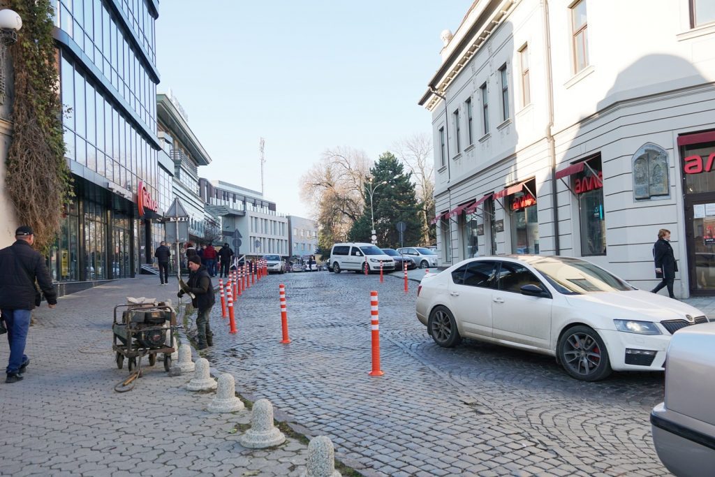 Антипаркувальні пластикові стовпчики встановлюють сьогодні в Ужгороді на площі Корятовича.