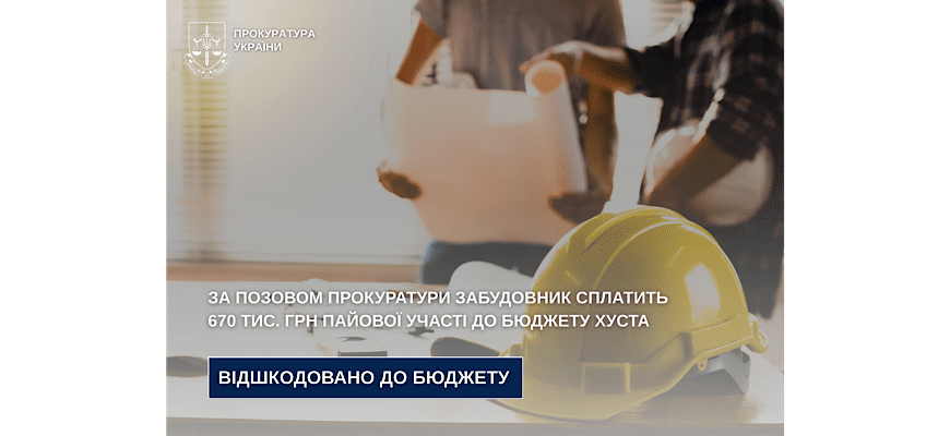 Хустська окружна прокуратура у судах першої та апеляційної інстанцій зобов’язала недобросовісного забудовника відшкодувати до місцевого бюджету 670 тис грн заборгованості зі сплати пайової участі у розвитку інженерно-транспортної та соціальної інфраструктури Хуста.