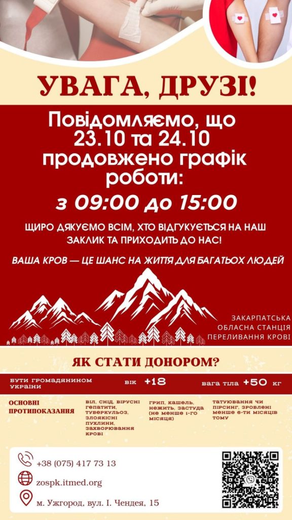 Для зручності донорів та у зв’язку з критичною нестачею компонентів крові Закарпатська обласна станція переливання крові до 23-24 жовтня розширює графік роботи до 15:00.