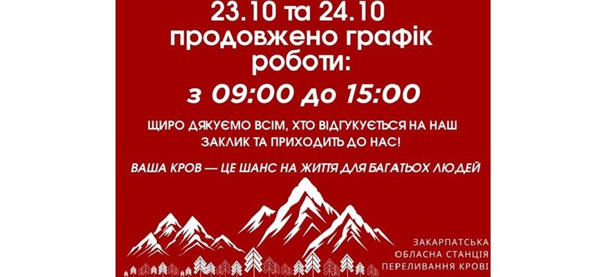 Для зручності донорів та у зв’язку з критичною нестачею компонентів крові Закарпатська обласна станція переливання крові до 23-24 жовтня розширює графік роботи до 15:00.
