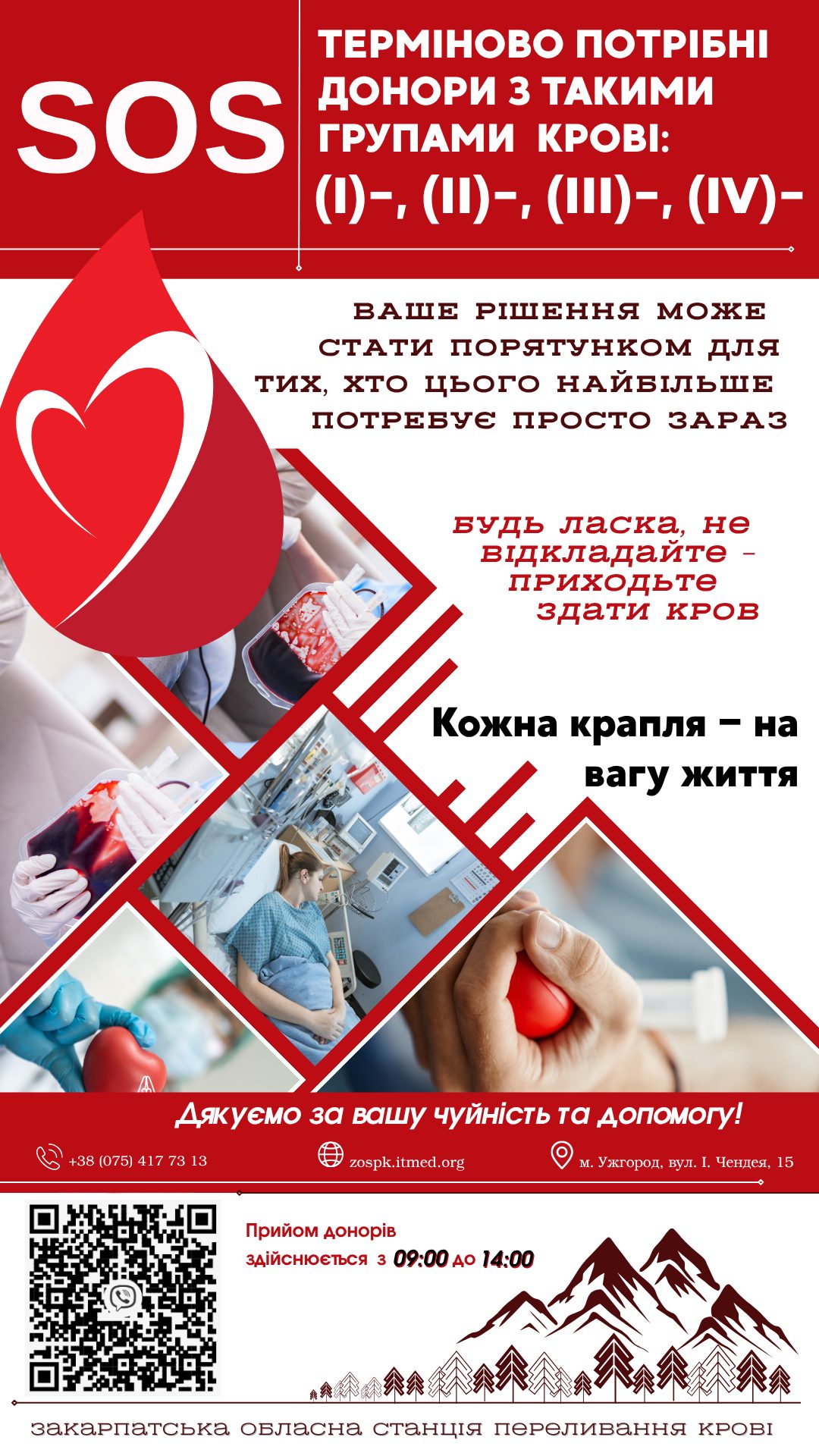 Закарпатська обласна станція переливання крові повідомляє про потребу в донорах крові кількох груп: (І)-, (ІІ)-, (ІІІ)-, (ІV)-.
