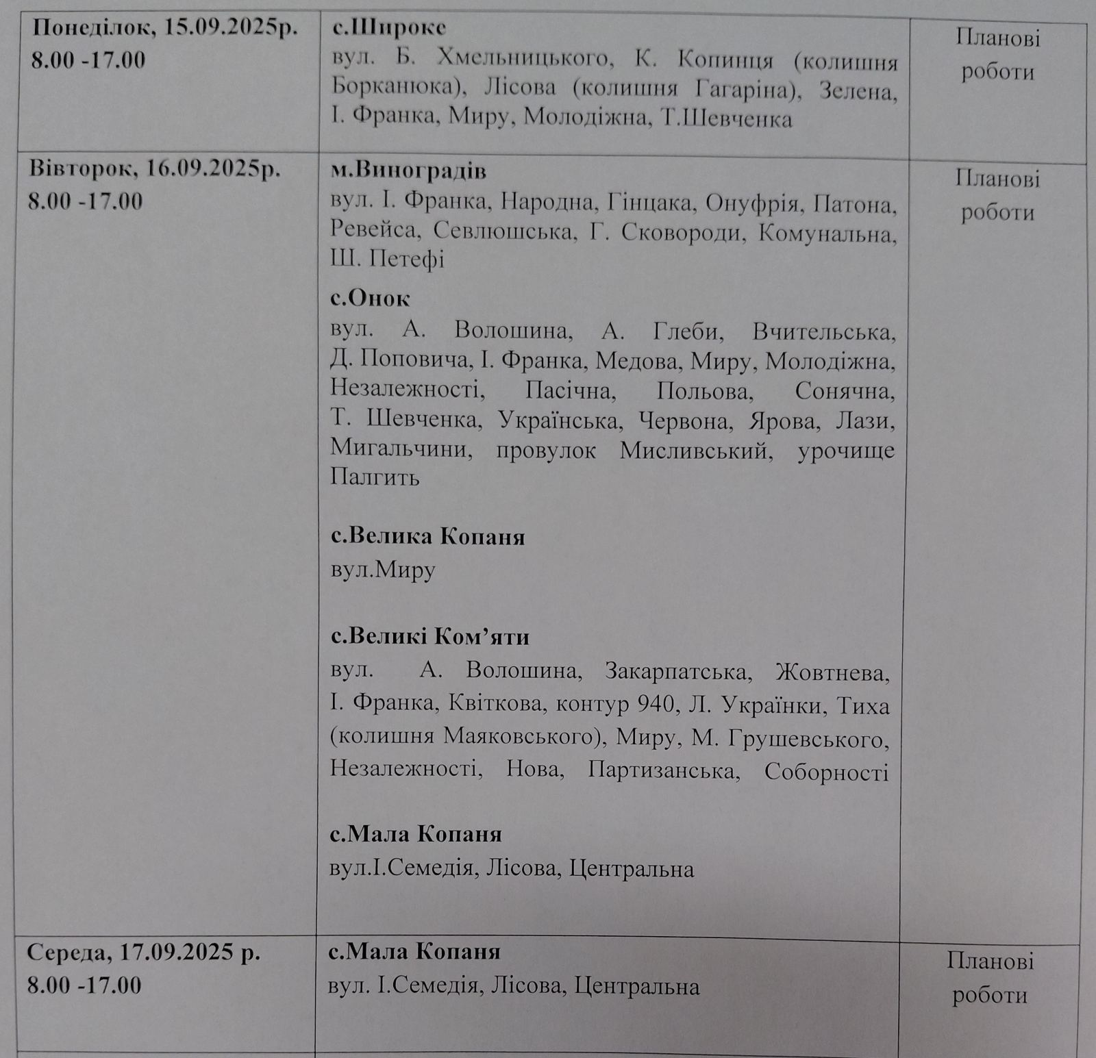Головна » Соціум Жителів Виноградівщини попереджають про відключення електроенергії Опубліковано: 8:00, 15.09.2025 Закарпатські новини Виноградівська міська рада відповідно до інформації ПрАТ «Закарпаттяобленерго» повідомляє про планові відключення електричної енергії.